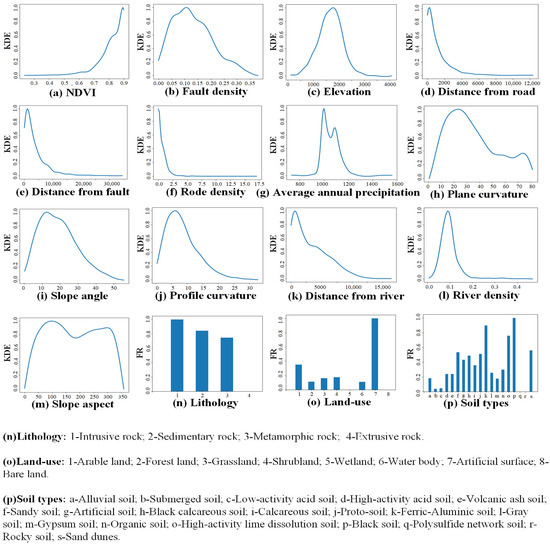 Kernel density estimation [37] is a method for estimating the probability density function of a population from a sample. Let be the values of an influencing factor x at n landslide points. The basic expression for kernel density estimation of the influencing factor x is as follows: