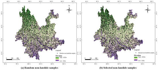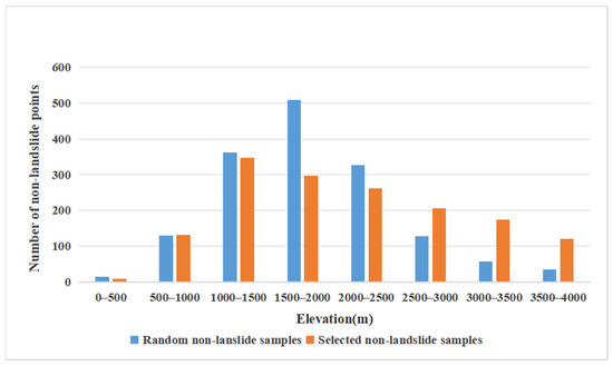 The spatial distribution of randomly selected negative samples (non-landslide disaster points) is shown in Figure 8a. The spatial distribution of negative samples guided by the determined rules is illustrated in Figure 8b. Combining the quantity of negative samples in various elevation categories, as shown in Figure 9, it can be observed that the number of samples obtained using the rule-guided selection method was significantly higher in the elevation range of 1500–2000 m, compared to the random selection method. As indicated by Figure 8b and Rule 3, the elevation range of 1500–2000 m is a high-risk area for landslides. Therefore, the selected samples demonstrate stronger robustness.