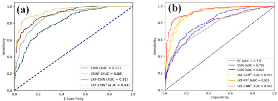 ROC curves of the (a) CNN, CNNS, LKF-CNN, and LKF-CNNS models and (b) RF, SVM, CNN, LKF-SVMS, LKF-RFS, and LKF-CNNS models.