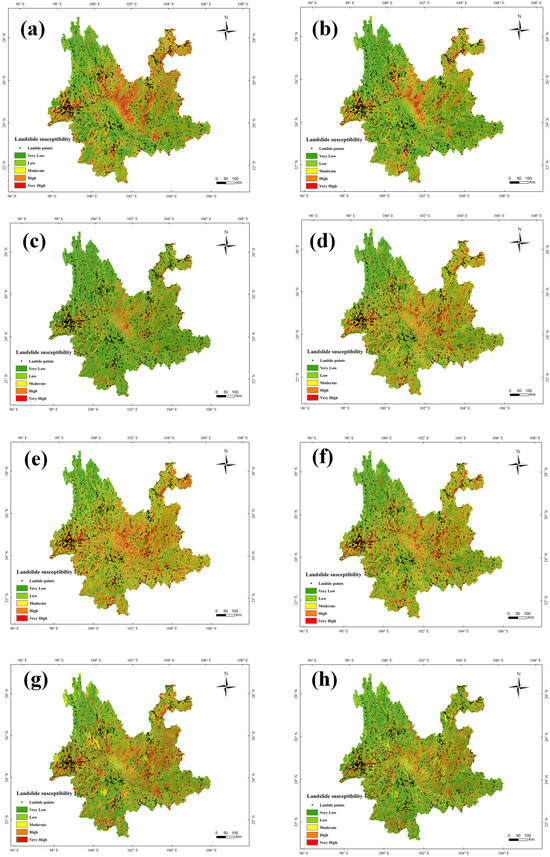 Landslide susceptibility maps generated using (a) CNN, (b) CNNS, (c) LKF-CNN, (d) LKF-CNNS, (e) RF, (f) LKF-RFS, (g) SVM, and (h) LKF-SVMS.