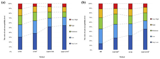 Percentages of different landslide susceptibility classes for (a) CNN, CNNS, LKF-CNN, and LKF-CNNS; and (b) RF, SVM, CNN, LKF-SVMS, LKF-RFS, and LKF-CNNS.