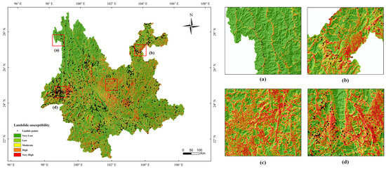 Landslide susceptibility maps generated using LKF-CNNS in (a) the northwest of Yunnan Province, (b) the northeast of Yunnan Province, (c) the central–northern part of Yunnan Province and (d) the western of Yunnan Province.