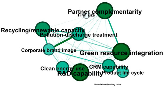 In the HPG study, a one-mode matrix was constructed based on the mapped criteria (Table 7). The four most influential nodes were identified as “green resource integration,” “partner complementarity”, “R&D capability”, and “recycling/renewable capacity”. Upon analyzing the relationships between these nodes, the following insights were gleaned: (1) “Green resource integration” exhibited strong connections with “partner complementarity”, “recycling/renewable capacity”, and “CRM capability”. (2) “Partner complementarity” demonstrated a strong connection with “green resource integration”. (3) Although “R&D capability” did not exhibit particularly strong connections with any specific node, it connected diversely with all nodes. (4) “Recycling/renewable capacity” showed strong connections with “corporate brand image”, “green resource integration”, and “pollution-discharge treatment”. Figure 2 visualizes these findings.