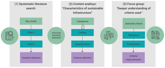 This paper explores the immediate need of infrastructure stakeholders for practical guidance promoting sustainable infrastructure development that aligns with the United Nations Sustainable Development Goals (SDGs) and European Union (EU) regulations. Despite overarching definitions, there is a noticeable absence of a uniform set of sustainability criteria, which delays the integration of sustainability principles into infrastructure planning, development, and operations. Through a targeted content analysis of the systematically selected literature from the Web of Science, this study seeks to clarify the characteristics of sustainable infrastructure. In the systematic review of 106 sources, carefully selected through a structured exclusion process described in the Open Science Framework register, the authors construct a comprehensive set of 43 sustainable infrastructure characteristics. Subsequently, these indicators undergo evaluation by sector experts through focus group discussions on the relevance of the proposed sustainable infrastructure criteria to local planning contexts. The focus group’s results demonstrate the adequacy of the proposed criteria, albeit with variations in perceived importance. Additionally, participants in the focus group suggest conducting field tests of the criteria in a municipal setting before scaling up to national policy frameworks.