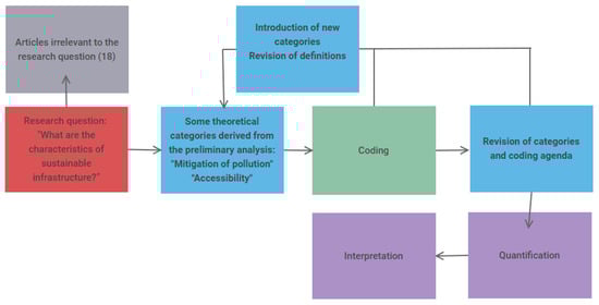 In this study, we employed Mayring’s [20] qualitative content analysis procedure as our guiding framework. The selected data underwent a systematic analysis, wherein content analytical units were identified incrementally, aligning with the research question, and subsequently organized into categories. We structured our criteria around the well-known Environmental, Social, and Governance (ESG) categories. To comprehensively assess sustainable infrastructure, we included an additional category focusing on state intervention economic benefits. These categories were established and refined throughout the analysis process through iterative feedback loops. Our approach involved inductive category development, as illustrated in Figure 3 and elaborated upon in subsequent text.