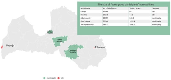 The benefits of the focus group method include collecting immediate, in-depth reflections on the material under discussion from a diverse group of stakeholders. To engage the municipalities, the research team contacted the Latvian Association of Local and Regional Governments and selected participants to ensure diversity, representing both larger cities and smaller municipalities (and excluding the capital city) in Latvia and providing wide geographical coverage of the country, as shown in Figure 4.