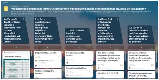 The sustainable infrastructure criteria identified within content analysis were further tested with a focus group composed of representatives of city development and territorial planning experts from five city municipalities of Latvia.