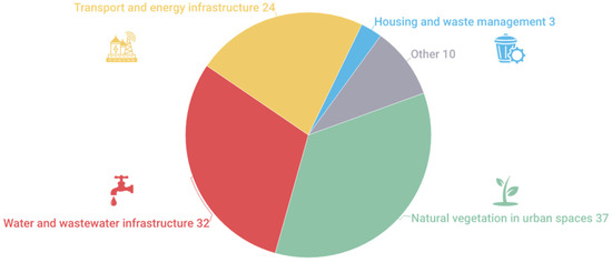 A total of 37 out of 106 of the articles discussed green infrastructure with an emphasis on greenery and natural vegetation in urban spaces, including streets, parks, walkways, urban forests, and walls and roofs of various buildings and structures ([22,23,24], etc.), as well as other aspects of nature-based solutions, biodiversity preservation, or facilitation in the urban environment [12,25,26].