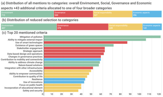 The initial categorization process began by considering three fundamental aspects of sustainability: Environmental, Social, and Governance, often alongside economic factors ([41,42,43], etc.). Results from this initial iteration revealed that these categories were mentioned 216, 190, 0, and 138 times, respectively, indicating a slightly higher emphasis on environmental aspects (39.71%) compared to social aspects (34.93%), with no exclusive focus on governance identified. Notably, around 25.37% of the references discussed the economic impact, albeit often treated as a conventional rather than sustainability-related topic. Following this, 43 specific criteria were identified outside of the broader categories of environment, social, and economic aspects, each defined in detail (refer to Table S1, “Definitions” sheet). For each of the developed criteria, mentions varied from as low as 3 times (e.g., potential for experiments) to as high as 119 times (e.g., mitigation of pollution) throughout the analysed quotes. The authors categorized each criterion into broader categories, as depicted in Figure 7a. Notably, the environment emerged as the dominant category in assessing the sustainability of infrastructure, with 715 mentions, representing approximately 33% of the total mentions. Following closely behind were governance and social responsibility, each comprising 24% of the mentions, with 530 and 527 mentions, respectively. Conversely, economic aspects appeared less prominently, with 396 mentions, constituting approximately 18% of the total mentions.