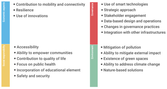 Circularity, biodiversity, landscape, and other aspects are often also seen through the lens of the above-mentioned categories. For instance, Suleiman et al. [42] discuss the collection of rainwater and other residual water that may be treated for further use in irrigating urban vegetation and reducing expenditure for water consumption.