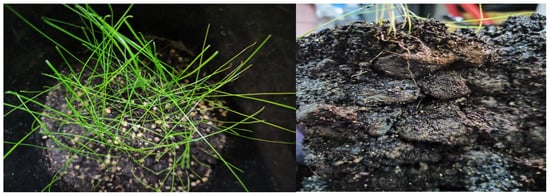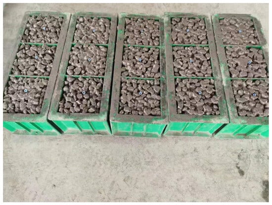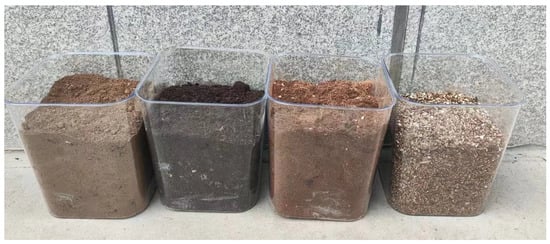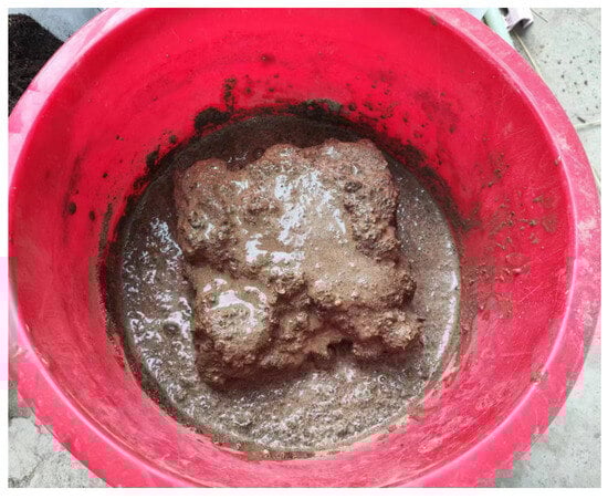 - Planting test: The experiment utilized three methods: pure soil natural planting, planting of test pieces after alkali reduction treatment, and planting of test pieces without alkali reduction treatment. Each method was set with 10 samples. Each sample had a planting area of 150 mm × 150 mm and 100 seeds of tall festuca were sown. The ultimate criterion was whether the roots of the tall fescue could penetrate the soil layer and reach into the concrete, to analyze the vegetative effectiveness of the plant-growing ecological concrete. As shown in Figure 3, the planting soil was a mix of inorganic soil, organic fertilizer, coconut coir, and vermiculite in a 7:2:2:1 ratio. As illustrated in Figure 4, soaking the specimens in nutrient soil diluted with water before the planting experiment can effectively fill the pores of the specimens, which is beneficial for the subsequent growth of the plants.