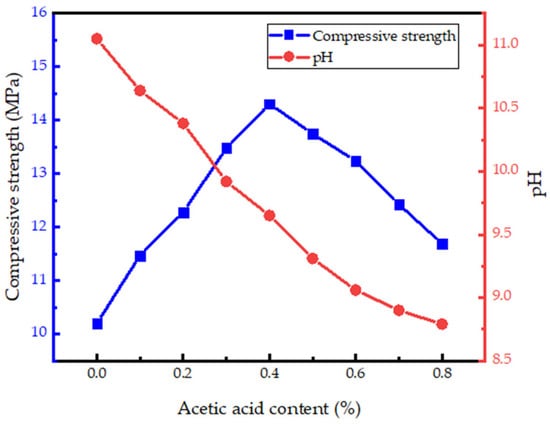 - Acetic acid, as an activator, can significantly enhance the compressive strength of plant-growing ecological concrete and reduce its alkalinity. An acetic acid content of 0.4% of the weight of the cementitious materials is optimal for improving the performance of plant-growing ecological concrete with the optimized mix. The test results show that the compressive strength increased by 40.29%, and the pH value decreased by 6.33%;