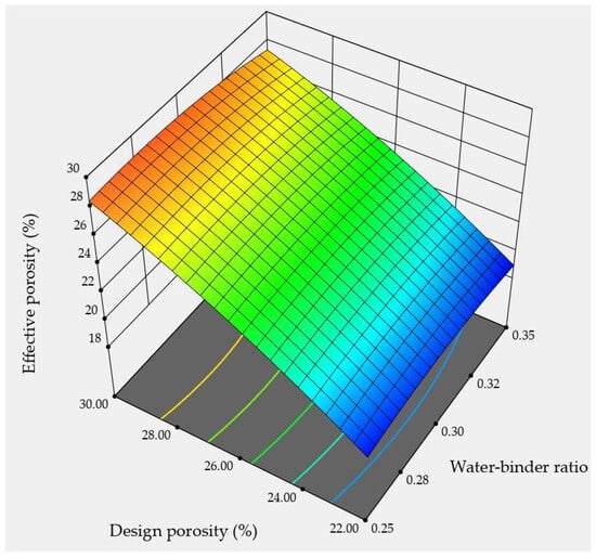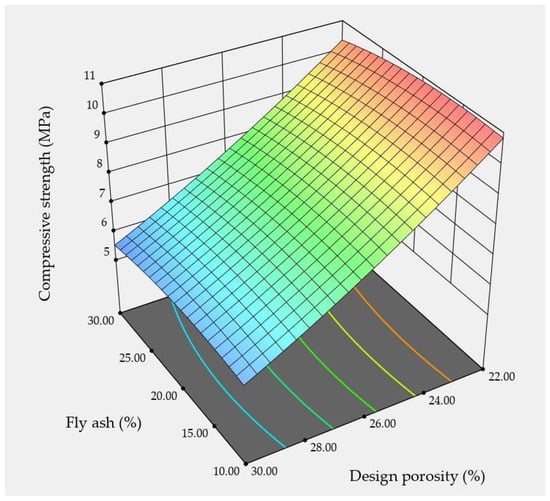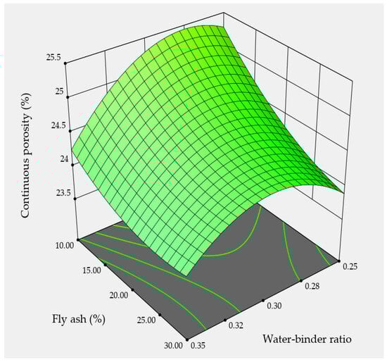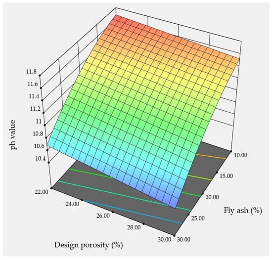 - The optimized mix proportion obtained by the regression model established through the response surface method is as follows: water-to-binder ratio of 0.30, fly ash content of 26%, and designed porosity rate of 22%. The predicted performance is a compressive strength of 10.32 MPa, continuous porosity rate of 20.00%, and pH value of 11. Further experimental validation showed that this mix proportion had a compressive strength of 10.11 MPa, a continuous porosity rate of 20.71%, and a pH value of 10.79. The errors were 2.03%, 3.55%, and 1.91%, respectively, all less than the 5% error range, indicating that the regression model about the basic properties of plant-growing ecological concrete established by the response surface method experiment is accurate and effective;