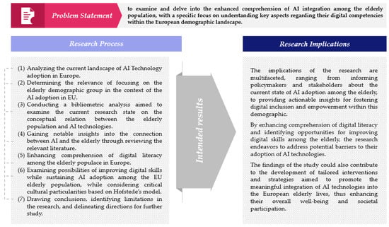 Currently, the adoption of AI technology in Europe represents an area of particular interest, with potentially significant implications for different demographic groups. Therefore, the research path aimed at achieving the predefined objective of the study required following a rigorous, structured process whose stages reside in interdependence (Figure 1).