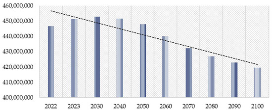 The issue of population aging is felt globally, as was already mentioned in the introductory part of the present research [4,5]. Considering the EU, Eurostat projections [65], actually representing “what-if scenarios” based on hypothetical developments (with assumptions for fertility, mortality, and net migration) of the size and structure of the population, reveal a significant decrease in it (Figure 2).