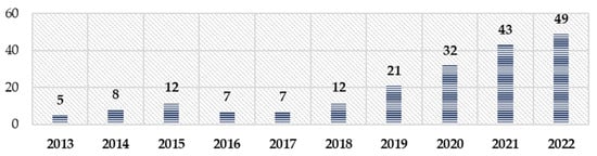 The number of scientific publications per year (2013–2022). Source: Illustrated by the authors based on data obtained after querying the Web of Science database.