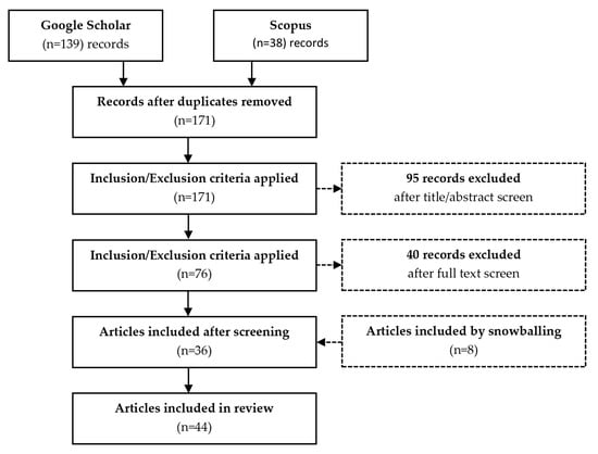 A scoping literature review was conducted first to identify the relevant QoL domains concerning the qualities of public spaces for older adults. The resulting articles were analysed using inductive thematic content analysis, and relevant QoL domains were identified (see Table 2). Then, a literature review was carried out to review each identified theme to find gaps in knowledge. Two searches were conducted, one in Google Scholar and one in Scopus. To obtain relevant journals and papers, keywords were carefully chosen. The search was conducted from November 2021 to January 2024 to retrieve all pertinent literature in the field. A combination of terms such as “quality of life”, “public space”, “city”, “community”, active-ageing”, “age-friendly”, “ageing in place”, “older person”, “older adult”, and “elderly” with appropriate Boolean operators were used to search in both Google Scholar and Scopus. Peer-reviewed and published journal articles and edited books in English were selected. Non-English articles, conference proceedings, and articles in press were excluded from the results. In addition, literature not related to older people, QoL, public space, or city was filtered and not included in this study. Overall, 139 articles were found on Google Scholar and 38 articles were found on Scopus. Abstracts were downloaded and reviewed. First, duplicates and articles without full-text availability were excluded. Overall, 141 references were excluded following the abovementioned exclusion criteria. Furthermore, 8 articles that were highly relevant were added to the approved list through snowballing, taking the total number to 44 articles as part of this scoping review (see Figure 1).