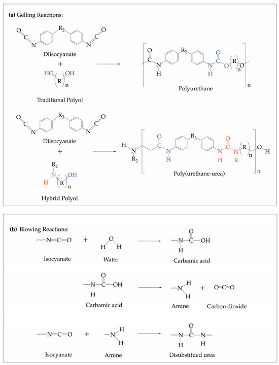 The synthesis of polyurethane prepolymer involves an exothermic reaction between isocyanates and polyol, as shown in Figure 1a. First, isocyanates react with the reactive hydrogen of polyols to form polyurethane prepolymer [1]. For the reaction of traditional polyol (hydroxyl-based polyol) and isocyanates, polyurethanes are formed exclusively. As for the reaction between hybrid polyol (amine-based polyol), polyurea forms along with polyurethane. On the other hand, the synthesis of polyurethane foam involves the addition of water as a blowing agent [53]. Blowing proceeds as the isocyanate reacts with the water present to form an unstable product, carbamic acid, which, consequently, decomposes to amine and carbon dioxide, as shown in Figure 1b.