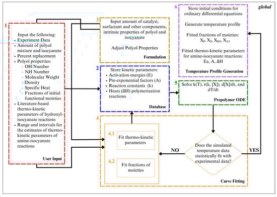 The User Input function comprises four prompts that gather key information: (1) the composition of the isocyanate and polyol mixture, and the percentage replacement of the amine-based polyol; (2) property values of the amine-based polyol, encompassing the hydroxyl value, amine value, molecular weights, functionality, density, and specific heat capacities; (3) property values of isocyanate, and (4) experimental data along with the reaction time and range and intervals for the fractions of the functional moieties. With regard to the property values of the amine-based polyol, the hydroxyl value of the polyol serves as a quantifier for the concentration of hydroxyl functional groups, while the amine value allows for the determination of secondary amine concentrations in the amine-based polyol. The molecular weight is necessary for estimating the molar quantities involved in the prepolymerization reactions. Density, on the other hand, aids in calculating the total volume of the reacting mixture, a critical factor for reaction rate determination. Furthermore, specific heat capacity values are crucial for assessing the heat capacities of chemical species, and pivotal for internal temperature calculation during the polymerization process. Lastly, the inputs for ranges and intervals for the functional moiety fractions were crucial for comprehensive exploration, enabling the identification of functional moiety combinations in the polyol system and ensuring robust, accurate simulation results.