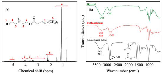 (a) 1H NMR of coconut-oil amine-based polyol derived from sequential glycerolysis-amidation functionalization; (b) FTIR spectra of glycerol, diethanolamine, and coconut oil amine-based polyol derived from sequential glycerolysis–amidation functionalization.