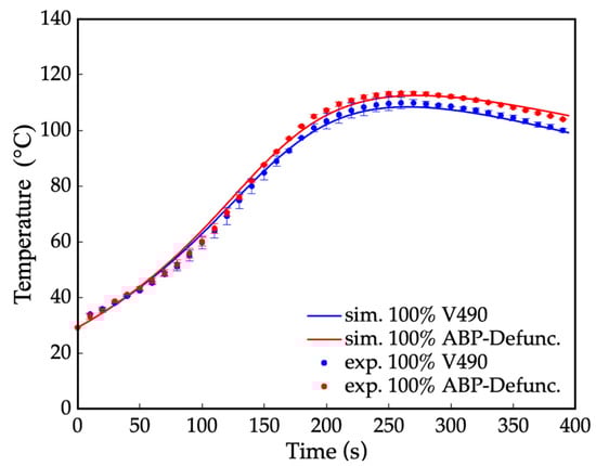 Additionally, the higher molecular weight of the amine-based polyol compared to V490 can be attributed to the relatively high molecular weight of the amine-based polyol components, such as coconut-oil-based diethanolamide, amino esters, and glycerol compared to the sucrose and glycerol main components of V490 [86]. It can also be observed that the functionality of the amine-based polyol was higher than that of the V490. This result can be attributed to the higher molecular weight of the amine-based polyol, thereby inducing higher reactive groups per molecule of amine-based polyol in contrast with V490 [87]. Furthermore, the density for the amine-based polyol was slightly higher than that of V490, which is consistent with the results regarding their molecular weight, implying that amine-based polyol had a greater mass over the volume occupied that constituted the total volume of reacting mixture from which molar concentration was derived. In turn, this may have influenced the calculated reaction rate. Lastly, the specific heat capacity of the amine-based polyol was higher than that of V490. A higher specific heat may lead to higher heat capacity, lowering the increase in heat progression according to Equation (1).