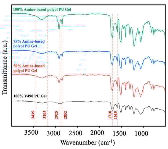 Furthermore, the prominent physicochemical properties of both the V490 and amine-based polyols were experimentally characterized, as outlined in Table 6. To begin, the total hydroxyl value was determined for both polyols, providing information on the concentration of the hydroxyl functional groups present in the polyol. It was found that the hydroxyl value of V490 was higher than the amine-based polyol due to its higher concentrations of hydroxyl-rich sucrose and glycerol units [84]. These units contribute to multiple secondary hydroxyl groups within a single polyol molecule. In contrast, the amine-based polyol, containing diethanolamide as a major component, had relatively fewer hydroxyl functional groups in one molecule than V490 [69,85]. It is worth noting that the individual hydroxyl moiety values of polyols cannot be experimentally characterized due to the absence of standard testing procedures.