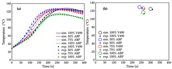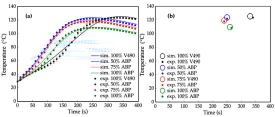 The internal temperature during the polymerization reaction at a given time, t, is computed using an energy balance equation derived from previous work by Zhao et al. (2013) [46], as represented in Equation (1):
