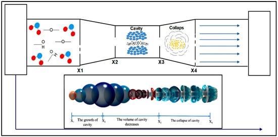 The primary factor contributing to this phenomenon is the simultaneous presence of significant temporal and spatial scales that encompass a wide range of magnitudes, encompassing entities, such as radicals and molecules at the smallest scale, to micron-sized cavities, and even cavitation devices spanning tens of centimeters in size. The effectiveness of an HC reactor or process is contingent upon several subprocesses, including the positioning, generation rate, and paths of cavities. These factors are influenced by the design of the flow rate, cavitation reactor, dissolved gases, pressure, temperature, and other relevant parameters [17]. The collapse of cavities and the resulting physicochemical effects occur when cavities are formed and transported by a flowing fluid [30,74]. During this process, the cavities undergo pressure fluctuations and, under specific conditions, undergo a violent collapse. The phenomenon of collapse results in the formation of concentrated regions with significantly elevated pressures and temperatures, accompanied by the occurrence of vigorous shear forces, high-velocity jets, and shock waves.