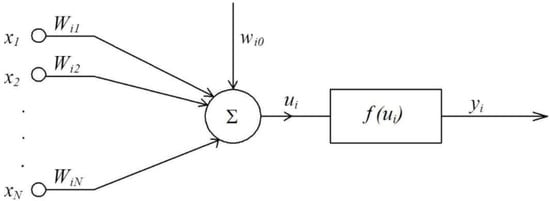 The model of the neural network emerged with McCulloch’s and Pitts’ seminal work, which was the first to describe a neuron in mathematical terms and associate it with data processing. One of the key elements of the model is summing up the input signals with an appropriate weight, and subjecting the result to the nonlinear activation function as shown in Figure 2 [57].