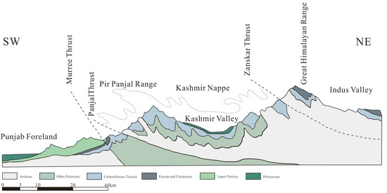 - Agarwal, K.K.; Shah, R.A.; Achyuthan, H.; Singh, D.S.; Srivastava, S.; Khan, I. Neotectonic activity from Karewa Sediments, Kashmir Himalaya, India. Geotectonics 2018, 52, 88–99. [Google Scholar] [CrossRef]