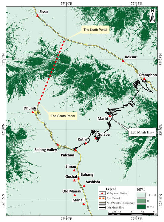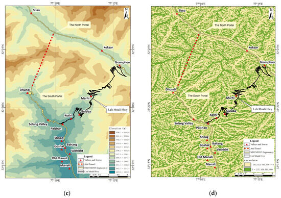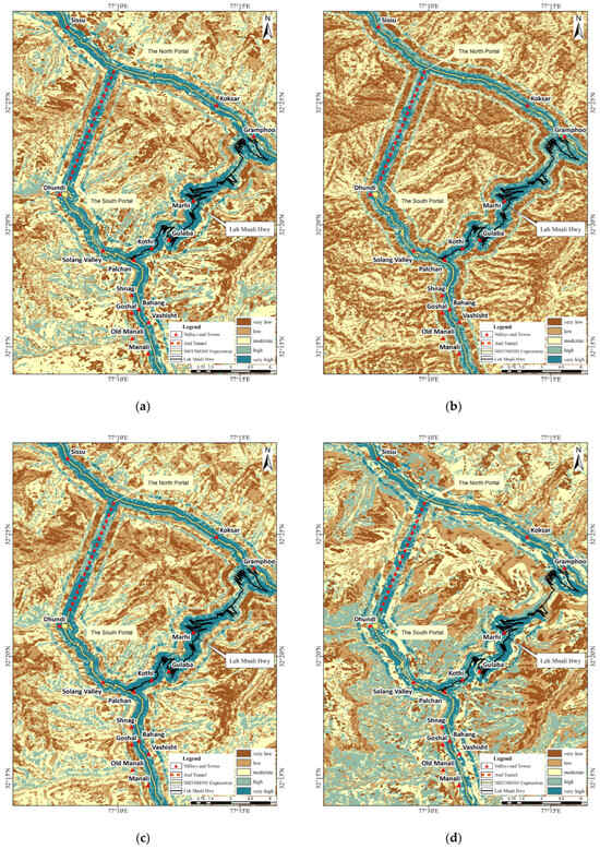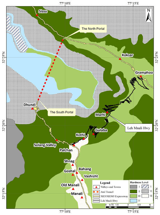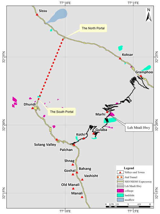 The study area features variable water conditions; it is drained by the Beas River, and its tributaries originate from several unnamed glaciers. The Beas River originates from the Beas Kund and is joined by streams originating from several hanging valleys. After cutting through a deep gorge with knife-sharp cliffs near Kothi, the Beas River then meanders between Kothi and the Rohtang Pass [49]. The tunnel’s north portal is located on the south bank of the Chandra River Valley, running to the northwest, whereas the south portal lies in the Solang River Valley, which is one of the tributaries of the Beas River (Figure 1). The sediments in this area comprise fine muds that are interrupted by coarse sands and conglomerates. An ancient moraine in the area forms a crescent-shaped longitudinal ridge, which is considerably preserved in the bed of the Beas River, to the west of Kulang [50]. Under certain circumstances, considering the complex geology and geomorphic conditions and extreme natural climate of the area, the region experiences frequent seismic activity and geological disasters, posing great challenges to the maintenance of operational safety. Considering the unique geological conditions, conducting a geological disaster susceptibility assessment is of paramount importance. Furthermore, it serves as an exemplary area for tunnel engineering research.
