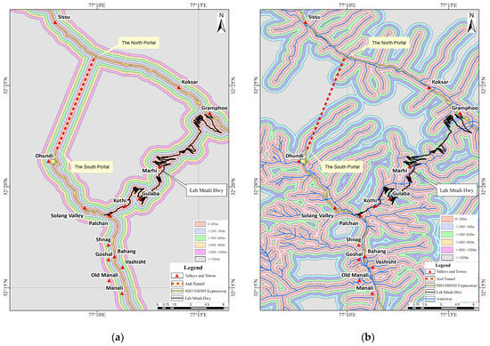 For the special case study of the Atal Tunnel, the buffer distance for roads is the distance to the central line of the tunnel. It can be considered as the factor related to human activity that is closely linked to the formation of a geological disaster [54,71]. The process of tunnel construction may destabilize the slopes on both sides of it and increase the fragmentation of rock. The roads data were converted into a grid format, and a buffer zone was divided into six classes at 200 m intervals from the central line of all roads within the study area (Figure 8a).
