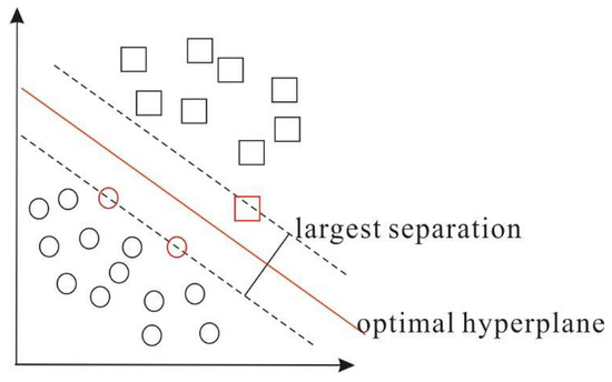 Principle diagram of SVM. (The squares and circles represent two types of samples respectively, and the red ones mean the point on the optimal hyperplane).