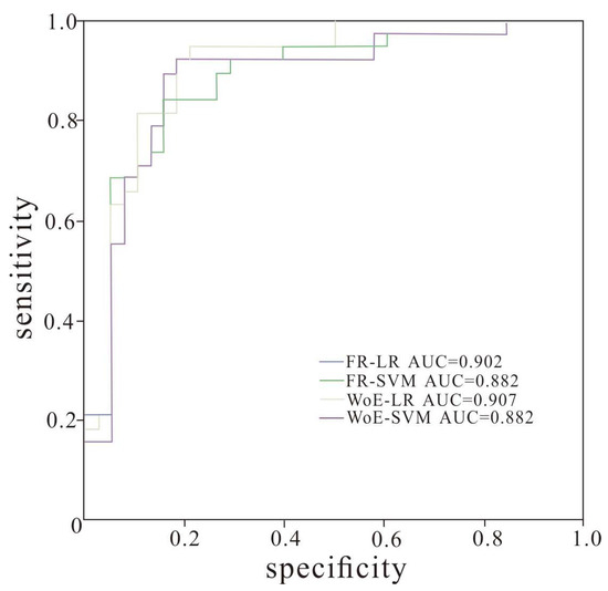 Geological disaster susceptibility analysis models are commonly assessed for accuracy using the receiver operating characteristic (ROC) curve and the area under the curve (AUC) metrics [84,85]. The evaluation accuracies of WoE-LR, WoE-SVM, FR-LR and FR-SVM are 90.7%, 88.2%, 90.2% and 88.2%, respectively. In the meantime, the AUC values are 0.907, 0.902, 0.882 and 0.882, respectively. The results reveal which method is more suitable for working in high-altitude areas. The accuracy rate obtained by the five calculation models exceeded 85%, and the WoE-LR model achieved the highest accuracy rate (Figure 11).