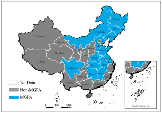 The classification of the MGPA is shown in Figure 2. Further, 13 provinces, including Hebei, Inner Mongolia, Liaoning, Jilin, Heilongjiang, Jiangsu, Anhui, Jiangxi, Shandong, Henan, Hubei, Hunan, and Sichuan, are designated as the MGPA and are considered as the experimental group in this study. The Chinese government selected these provinces to become MGPAs because they have a relatively high proportion of grain cultivation and there is less policy resistance to raising the proportion of grain cultivation. According to the China Statistical Yearbook, the average proportion of grain cultivation in MGPA areas was 72.8 percent from 1999 to 2003, in comparison to 71.1 percent in non-MGPA areas. Concurrently, MGPA provinces accounted for 68.2% of the national grain cultivation area during this period, which is of great significance in guaranteeing food security, which is the main purpose of establishing MGPA. Moreover, the prevalence of plains in these provinces is conducive to the promotion of mechanized production, which is of paramount importance in the context of agricultural mechanization. The remaining 18 provinces in mainland China serve as the control group.