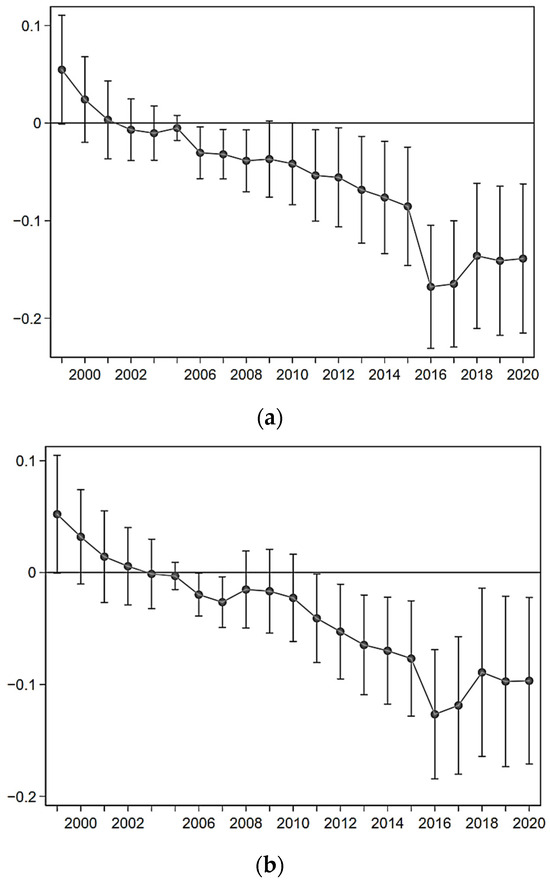 Based on 2004 as the benchmark lever, considering that the MGPA policy started in 2004, this study sets the time dummy variables to carry out the parallel trends test. In Figure 3, the p-value of the coefficient before the policy implementation (1999–2003) is not significantly different from 0, indicating that no violation of the parallel trends hypothesis was found between MGPA and non-MGPA before the MGPA policy was implemented. The coefficient after the MGPA policy’s implementation (2005–2020) overall shows a decreasing trend, and it is different from zero, indicating that the MGPA policy significantly suppresses ACE.