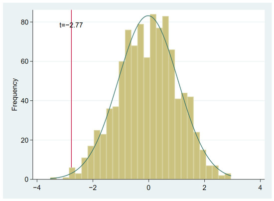 Distribution of t-statistic values of the MGPA through 1000 random simulations. Note: The horizontal axis represents the simulated -statistic value, and the vertical axis represents the number of occurrences of the simulated t-statistic; the curve is a normal distribution with mean being 0; the vertical line is the actual t-statistic value −2.77.