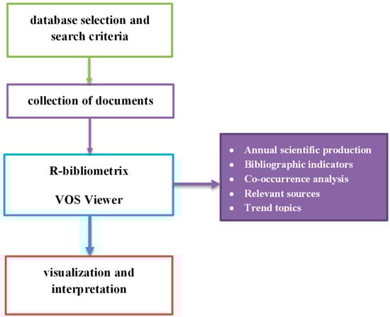 The collected manuscripts were organized in a Microsoft Excel sheet, categorizing them by publication year, subject area, document type, and the author’s institutional affiliations. The visualization and bibliographic mapping of the results were conducted using the VOS Viewer version 1.6.20 (https://www.vosviewer.com/ (accessed on 15 April 2024)) and R-bibliometrix software (https://www.bibliometrix.org/home/index.php/download (accessed on 15 April 2024)). A co-authorship analysis was carried out using the full counting method, which treats each co-authorship equally. This method was also applied to examine the occurrence of keywords within the titles, abstracts, and texts of the manuscripts. The bibliometric analysis followed a structured approach, establishing research criteria and questions and selecting an analysis approach that included various parameters such as year, subject area, document type, and more. The process continued with the selection of bibliometric data and their analysis using bibliometric software, culminating in creating networks and visual figures and interpreting these outcomes [5,10] (Figure 1).