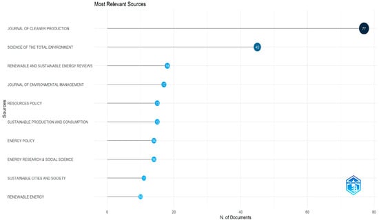 The provided scatter plot, labeled “Most Relevant Sources”, illustrates the distribution of documents across various scientific sources and depicts which journals are the most prolific or influential within a specific research domain or time frame. The Y-axis lists the names of the sources, while the X-axis quantifies the number of documents published. The “Journal of Cleaner Production” markedly dominates, with a significantly higher number of records (77) than other sources, indicating its prominence and possible influence in the field. Other sources, such as “Science of the Total Environment” and “Renewable and Sustainable Energy Reviews”, also contribute notable numbers, with 45 and 18 documents, respectively. The size of the markers correlates with the volume of documents, highlighting the relative contribution of each source to the overall body of work (Figure 3).