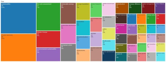 The treemap presented is a visual representation of the frequency of keywords within a given dataset (Figure 5). This type of visualization helps quickly identify which concepts are most commonly associated with the dataset and potentially the relative importance or focus areas of the research or publications analyzed. Each block’s size corresponds to the term’s frequency, with larger blocks indicating more occurrences. The term “sustainability” has the largest block, showing 76 occurrences, constituting 11% of the total, making it the most prominent term in the dataset. “Circular economy” follows closely with 68 mentions, accounting for 10%. Other terms with a significant presence include “life cycle assessment”, “climate change”, and “environmental sustainability”, indicating these are critical topics within the scope of the data. More minor terms, while less frequent, still show diversity in the dataset, with topics ranging from “digitalization” to “energy efficiency” and “waste management”.