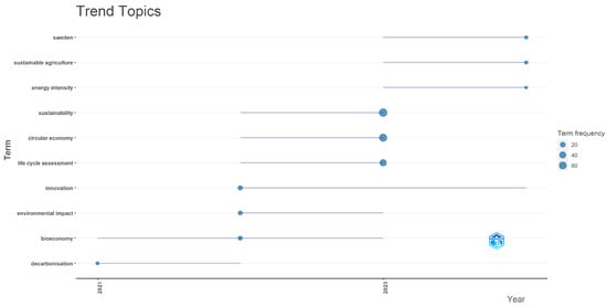 Figure 6 communicates the dynamic nature of topic popularity and can be instrumental in understanding trends and shifts in research focus over time. The “Trend Topics” visualization displays a range of terms along the Y-axis, each associated with a horizontal timeline reflecting their prominence over a specified period. The size of the circles on the timelines indicates term frequency, with larger circles representing a higher number of occurrences. The visualization suggests that topics such as “sustainability”, “circular economy”, and “life cycle assessment” have maintained a relatively consistent and significant presence over the timeline. In contrast, terms like “decarbonization” and “bioeconomy” appear to have emerged more prominently only in more recent years, as indicated by the commencement of their timelines and the size of the circles towards the present year. This pattern may reflect evolving priorities and innovations in environmental and sustainability discourse.