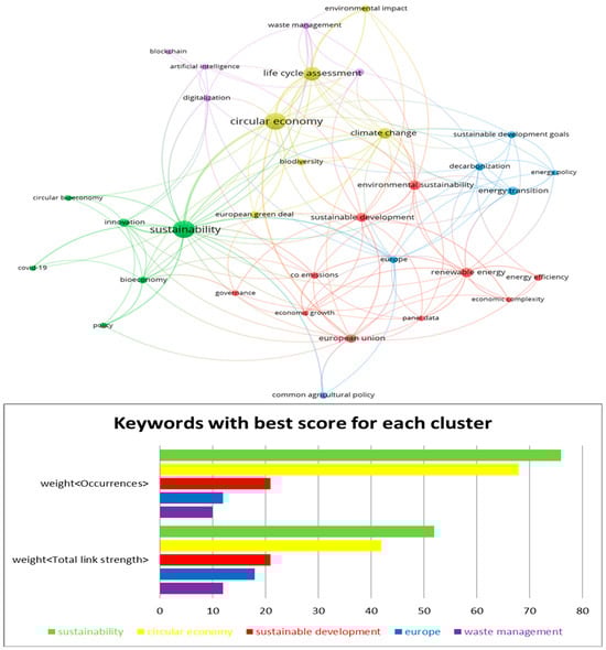 Yellow Cluster: Appears to concentrate on sustainability and its assessment, with central terms like “sustainability”, “circular economy”, and “life cycle assessment”, indicative of the methodological approaches to evaluate sustainability.
