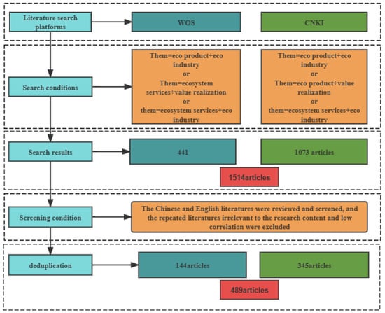 This paper is based on the CNKI and Web of Science database platforms, and the final search date was 1 April 2024. The search category was “topics”. This study was searched in CNKI as “eco-products + eco-industry and eco-products + value realization as well as ecosystem services + eco-industry” and in WOS as “eco-products + eco-industry and ecosystem services + value realization as well as ecosystem services + eco-industry”. A total of 489 relevant foreign and domestic documents were retrieved, including 144 English documents (including 113 articles, 26 review articles, 1 early access, 0 editorial materials, 4 proceedings papers, and 0 book chapters) and 345 Chinese documents (including 199 journal papers, 50 master’s dissertations, 11 doctoral dissertations, 17 conference papers, 65 newspapers, 2 achievements, 1 book, 0 yearbooks, 0 patents, and 0 standards). The retrieval process is shown in Figure 2.