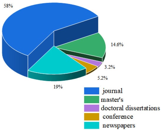 The distribution of the literature content is shown in Figure 4. The literature is classified and summarized into the following five categories: eco-product supply capacity assessment, eco-product value accounting, eco-product value realization, eco-industry formation, and other research. Among these, eco-product theory research accounts for 8% of the total literature, with 33 related articles. This research mainly focuses on supply capacity assessment and strategies for enhancing supply capacity in specific study areas. Eco-product value accounting accounts for 3.2% of the total literature, with 16 related articles. This research mainly focuses on the ecosystem’s total production value accounting and product total value accounting in provinces, cities, districts, counties, and specific regions. The mechanism of eco-product value realization accounts for 56% of the total literature, with 274 related articles. It has the largest proportion and focuses on exploring the value realization paths and theoretical research and analysis of different eco-products in specific regions with development prospects, different professional perspectives, and different classifications. The mechanism of eco-industry formation accounts for 24% of the total literature, with 122 related articles. This research mainly focuses on the relationship between eco-product value realization and the eco-industry. Other research accounts for 6.7% of the total literature, with 44 related articles. This research mainly focuses on theoretical research on eco-products and the eco-industry, as well as future prospects. In summary, the current research on eco-products and the eco-industry has a short history. Most of the literature is still in the qualitative research stage of summarizing practical experience and thinking, theoretical analysis, and exploring paths. Some quantitative research focuses on eco-product value accounting and supply capacity assessment. The content study of the literature is shown in Figure 4.