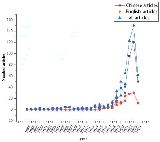 Based on the Chinese National Knowledge Infrastructure (CNKI) (https://www.cnki.net, accessed on 1 April 2024) and Web of Science (WOS) (https://webofscience.clarivate.cn/wos/woscc/basic-search, accessed on 1 April 2024) core databases, a literature search was conducted. The search time was up to 1 April 2024.