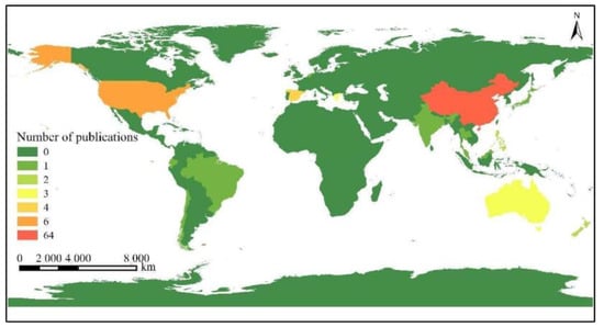 From an international perspective, countries such as the United States, Spain, Greece, and Australia have also achieved certain results in the field of realizing the value of eco-products and the development of eco-industries. This indicates that these countries have certain strengths in ecological environment protection and sustainable development. Countries such as Greece, Australia, the Philippines, Africa, New Zealand, Italy, Thailand, Japan, Brazil, Sweden, India, Malaysia, Ecuador, Denmark, Chile, and the Netherlands have also achieved certain results in their research work. This means that these countries also have certain strengths in ecological environment protection and sustainable development (Figure 6).