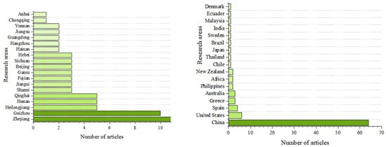 In Chinese literature, Zhejiang has the highest number of published articles as a research region, reaching 12 articles, followed by Guizhou, Heilongjiang, Hunan, and Qinghai, with more than 5 research documents. The number of documents in Shanxi, Jiangxi, Fujian, and the other 14 provinces (cities) is less than five.