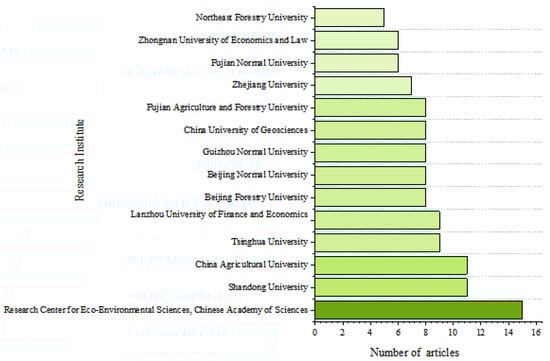 This article uses the occurrence probability of published documents by institutions as a basis to interpret and analyze the distribution of documents published by institutions. Then, it sorts them from low to high. From the perspective of research institutions that publish documents, there are currently many research institutions and universities in the field of research on the realization of eco-product value and eco-industry. Therefore, this study classifies and counts research institutions and universities that have published more than two documents. The result shows that there are three main types of publishing institutions: (1) Institutions that have long been engaged in eco-product-related research and have certain experience and research foundations. Similar institutions include the Research Center of Ecological Environment of the Chinese Academy of Sciences, which has published 15 articles. (2) Institutions in specific pilot areas for realizing the value of eco-products at the national level. Zhejiang University has published seven documents. (3) Higher vocational colleges related to forestry, agriculture, geography, and economics. China University of Geosciences has published 8 related documents; Tsinghua University has published 9 related documents; Beijing Forestry University has published 8 related documents; Northeast Forestry University has published 5 related documents; and China Agricultural University has published 11 related documents. Finally, foreign universities, such as the University of California, which has published nine related documents; the University of Western Australia and James Cook University, which have each published seven related documents; the Swedish University of Agricultural Sciences, which has published six related documents; the National Autonomous University of Mexico and Exeter University, which have each published five related documents. The top ten authors who contributed the most to the number of published documents are Zhang Linbo (7), Zhou Yihong (7), Qiu Shuilin (6), Wang Jinnan (3), Gao Xiaolong (3), Wang Zhen (3), Liu Gengyuan (3), Wang Xiaohui (3), Yu Huiyi (2), and Peng Wenying (2) (Figure 7).