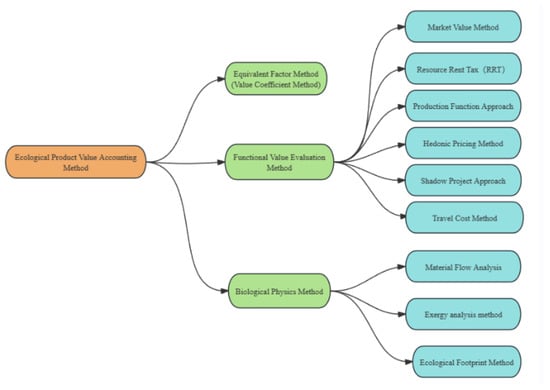 The biophysical method takes the resource endowment of the ecosystem as the starting point and measures the value of ecosystem services by quantifying the physical costs required to produce certain ecosystem services. The main methods include material flow analysis, energy analysis, and ecological footprint analysis. Due to the maturity of “3s” technology, foreign scholars have developed multiple comprehensive ecosystem service evaluation models based on spatial patterns and land use changes. Typical models include the integrated assessment model for ecosystem services and trade-offs (InVEST) and the artificial intelligence model for environment and sustainable development (ARIES). Among them, the InVEST model is relatively mature and can be used to evaluate nearly 20 types of services for land and sea; the ARIES model can evaluate multiple ecosystem services with high evaluation accuracy and has good development prospects. Figure 8 shows the commonly used accounting method for eco-products in China.