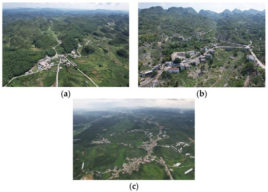 Overview of karst desertification control villages: (a) karst desertification control plateau mountain villages; (b) karst desertification control plateau canyon villages; (c) karst desertification control plateau basin villages.
